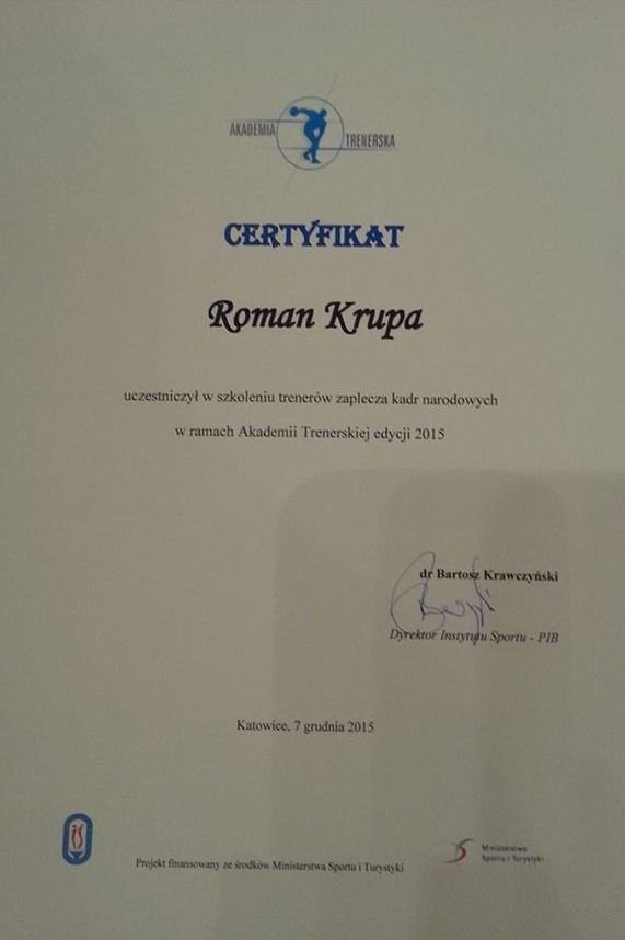 Nasi trenerzy, Marcin Szeląg i Roman Krupa wzięli udział w szkoleniu dla trenerów zaplecza kadr narodowych, które odbyło się 07.12.2015 w Katowicach, zorganizowane przez Akademię Trenerską ( www.akademiatrenerska.pl ), będącą projektem Ministerstwa Sportu i Turystyki, a koordynowanym przez Instytut Sportu w Warszawie.