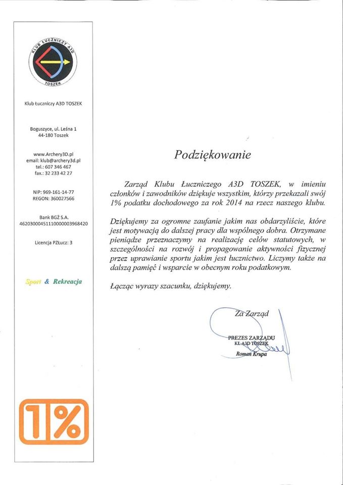 Zbliża się czas rozliczeń podatkowych za rok 2014 i możliwość przekazania 1% podatku dla KLUBU ŁUCZNICZEGO A3D TOSZEK. Poniżej znajdziesz instrukcję wypełnienia rocznej deklaracji PIT. Wydrukuj i koniecznie przekaż osobie rozliczającej Ciebie i Twoich znajomych. Jeżeli sam(a) się rozliczasz, możemy przekazać Ci program do wypełnienia PIT wraz z instrukcją. Skontaktuj się z nami email: klub@archery3d.pl